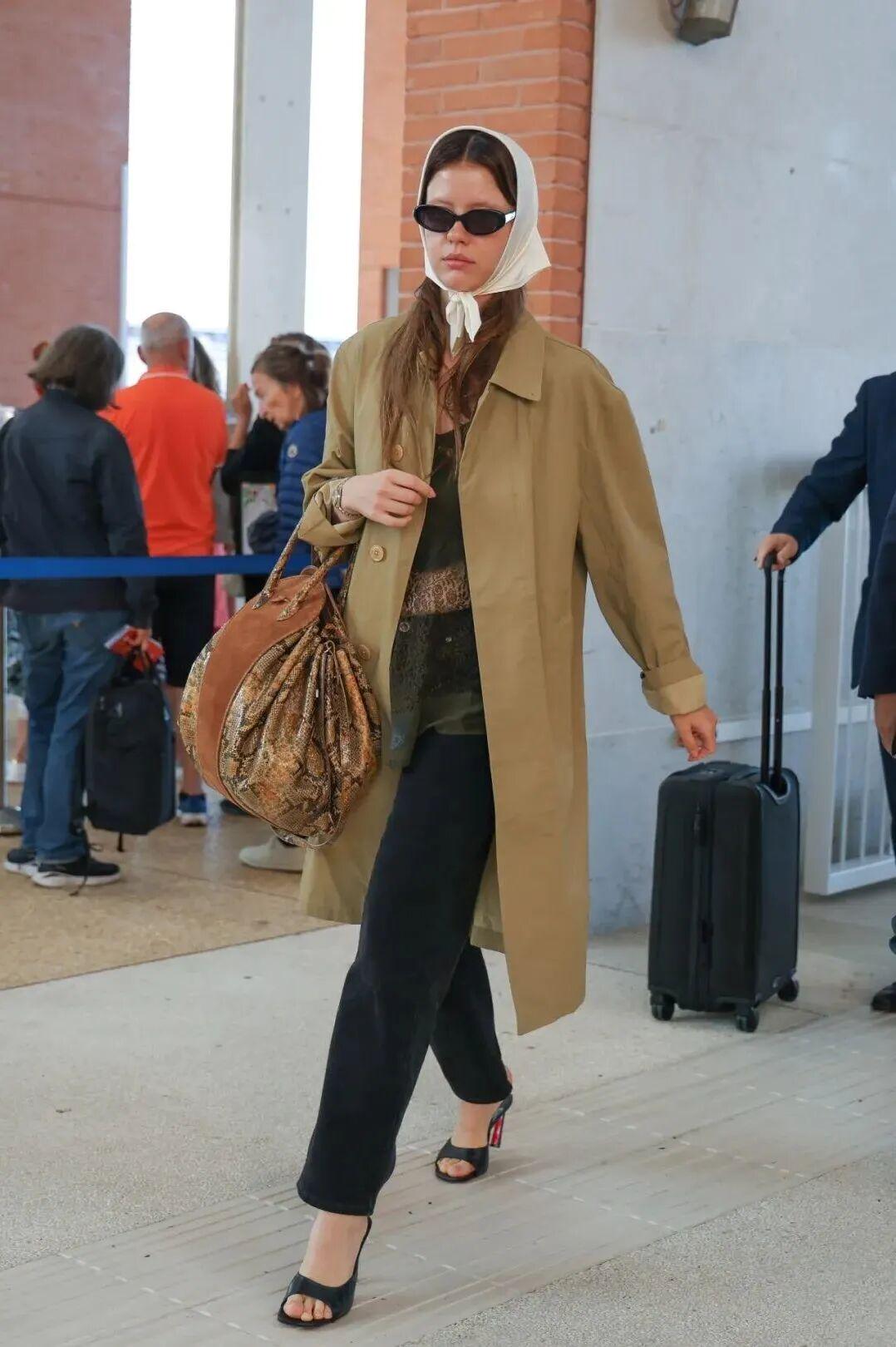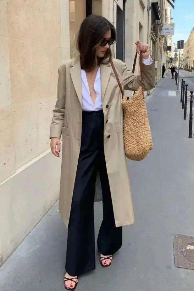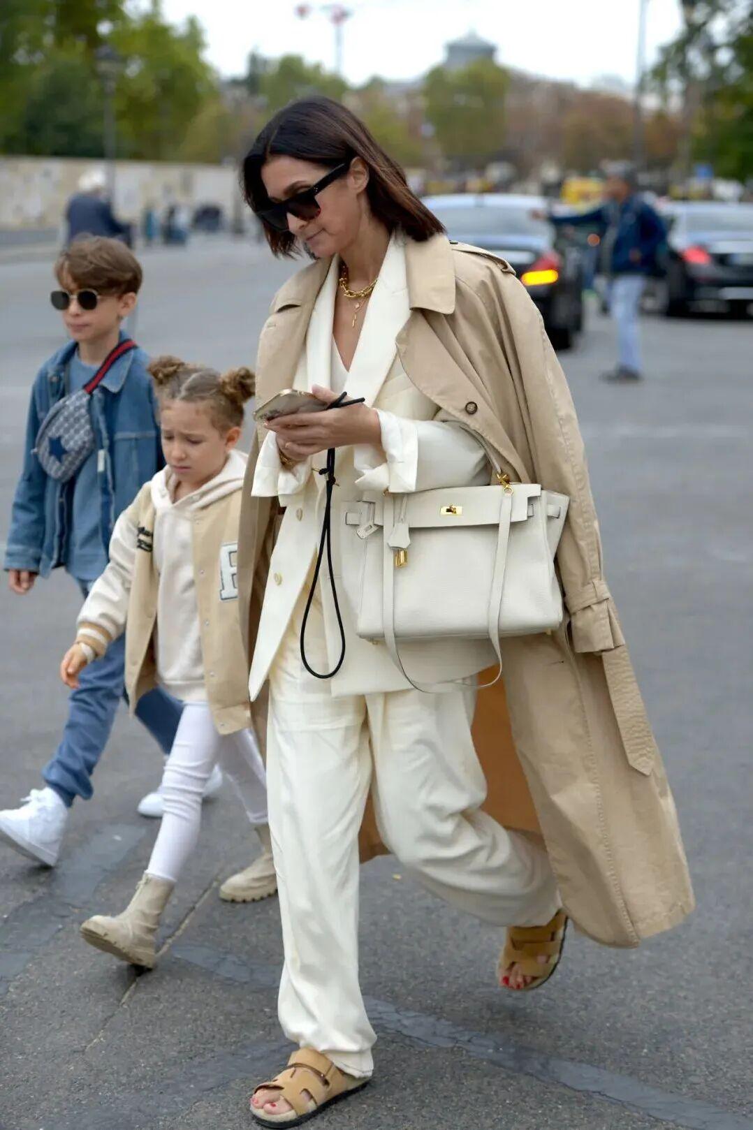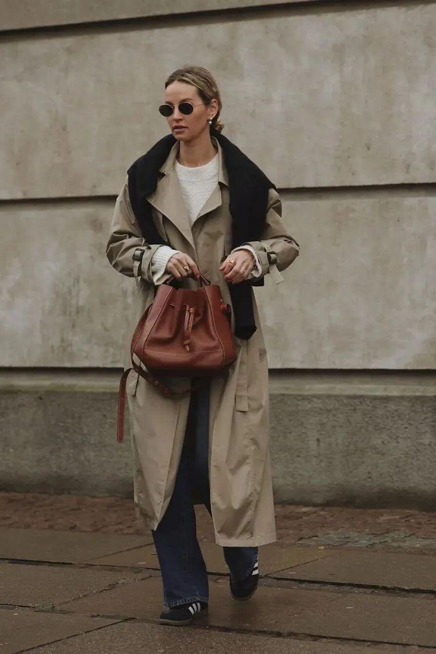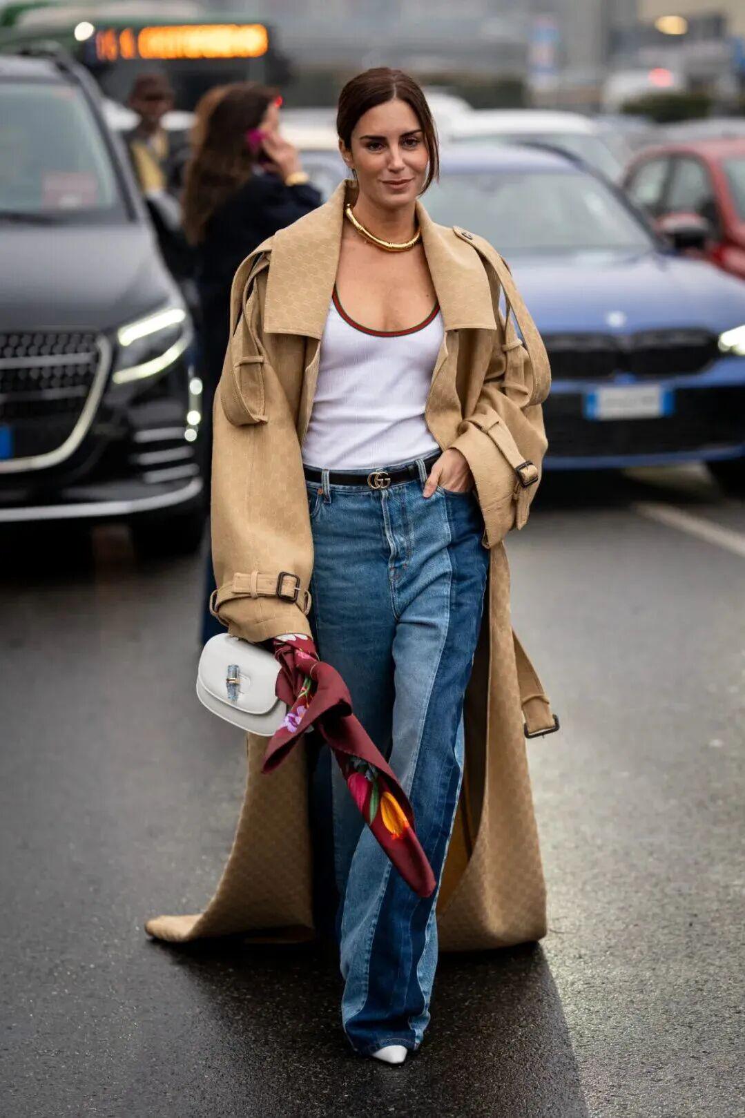 一袭松散的风衣敞开穿有种慵懒的法式风情,随意跨在肩头的背包和围巾透着毫不刻意的慵懒,氛围感十足。