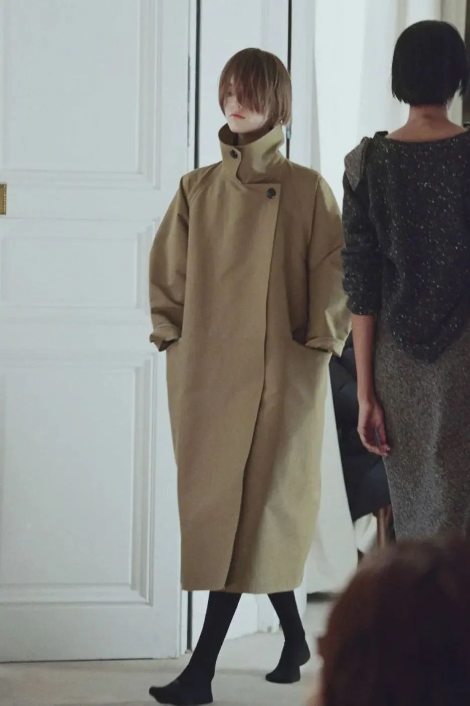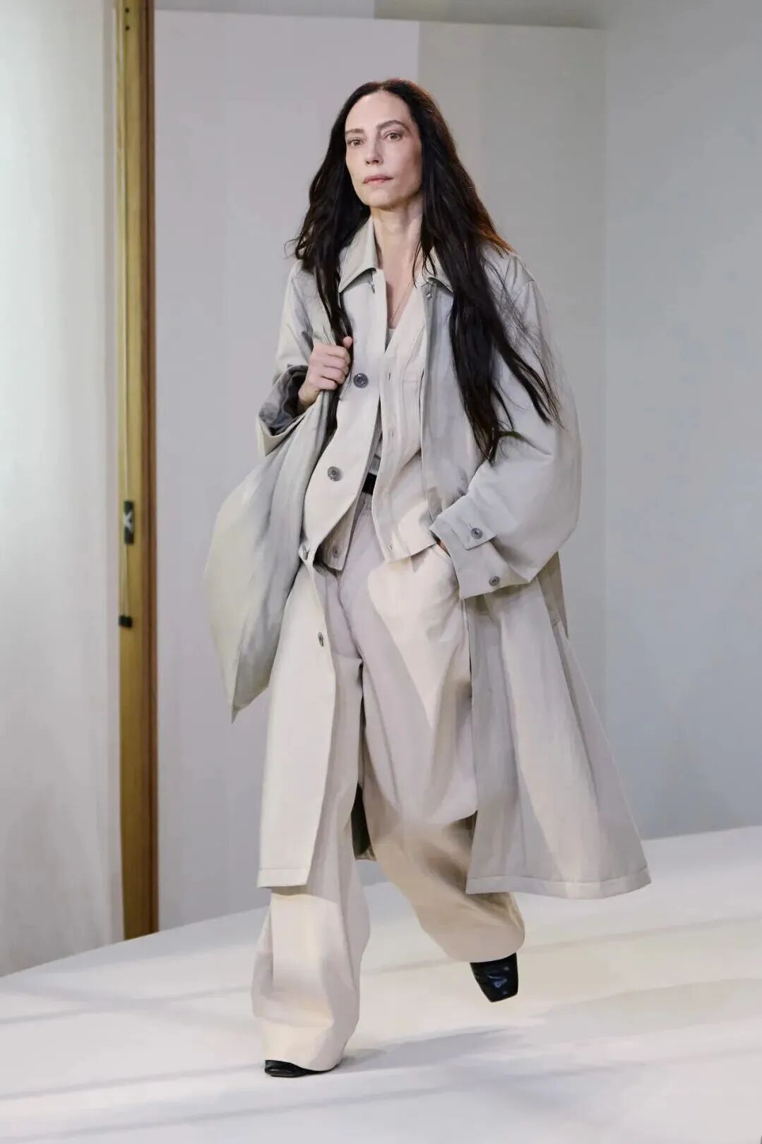 这种简单大气的工装风很自然地带来文艺极简感。时而充满诗意,时而清冷,令人捉摸不透,却又遗世独立。在Lemaire 2025秋冬系列的秀场上,偏灰的冷色调让风衣呈现出一种高级的文艺感。