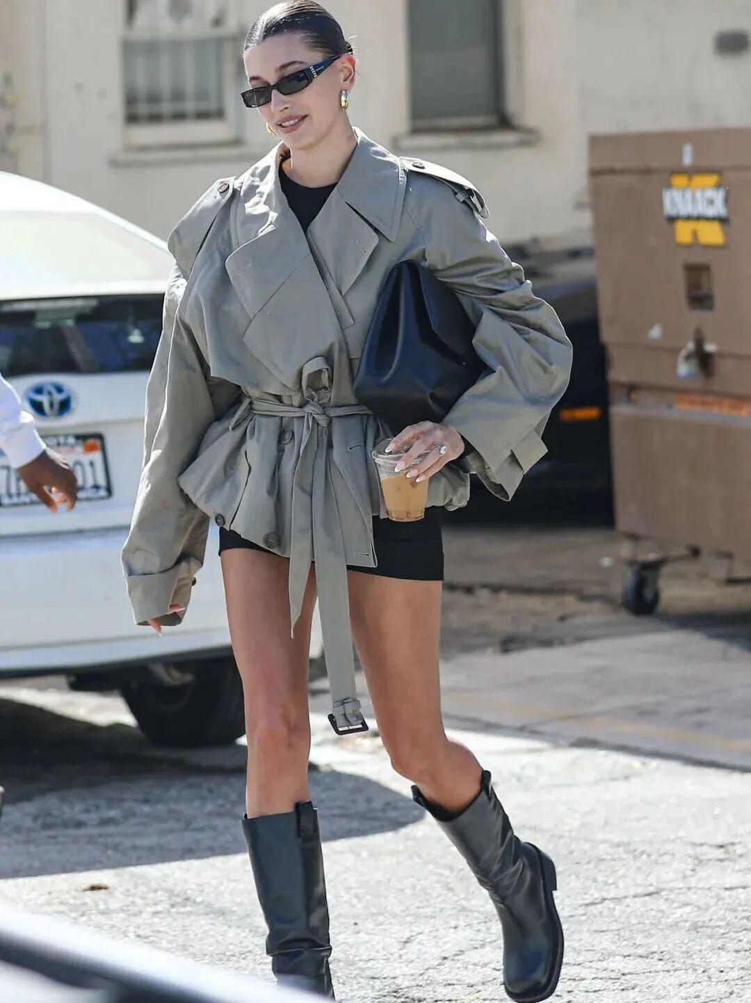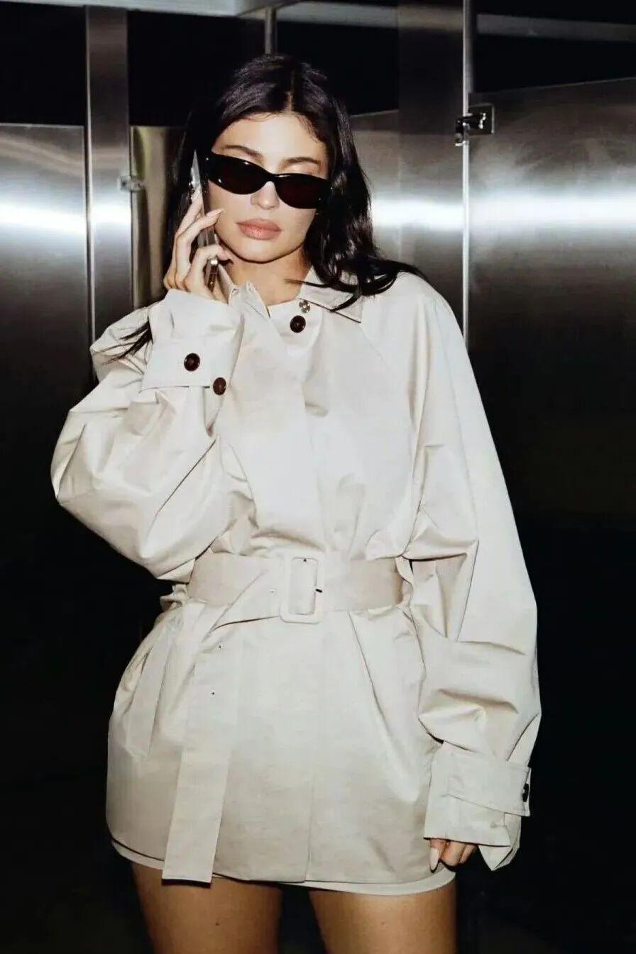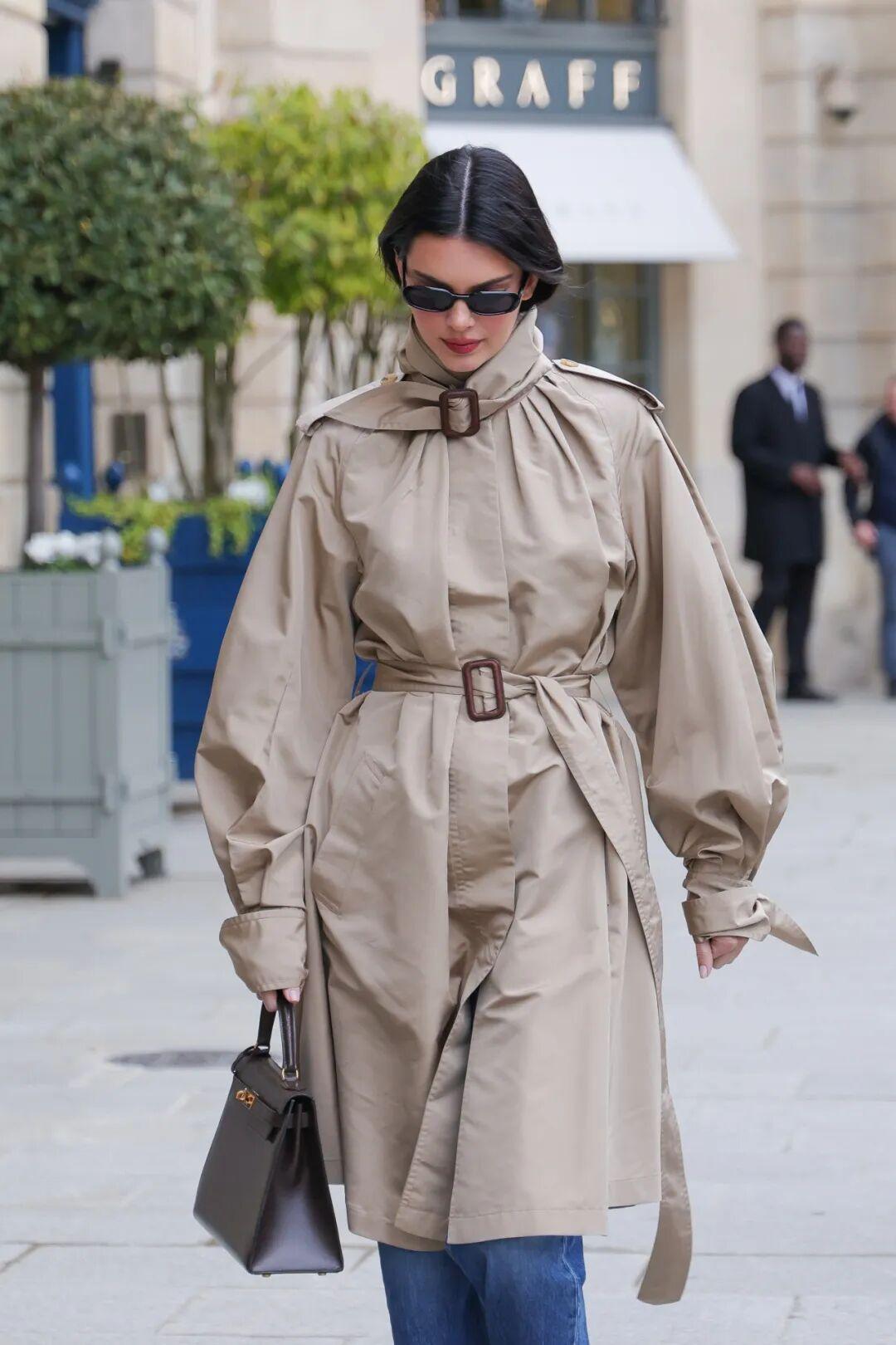 如果想显腿长,短款风衣可能会更适合你。Lisa和Kylie今年就有演绎短款风衣,因为风衣足够短,上半身的廓形则会更加明显,女性的力量感也更容易展现,简单搭配裤装或者下身失踪的造型很有态度。