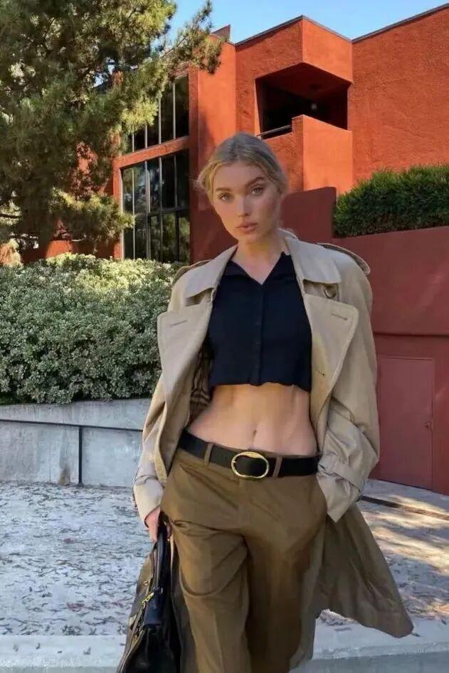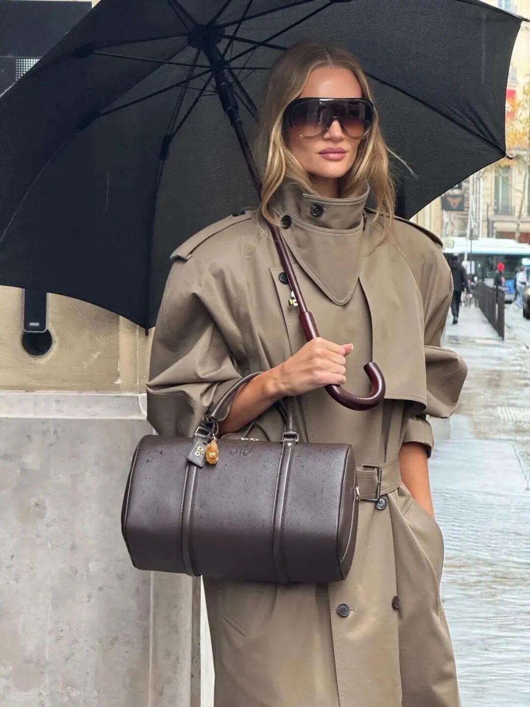 当风衣裹住脖颈、盖住半张脸,气场瞬间跃升。漏斗领风衣,就是这种力量的化身。像是Elsa Hosk、Rosie huntington whitley接连演绎,那份“武装到颈”的气势,像极了当代女性的温柔锋芒。